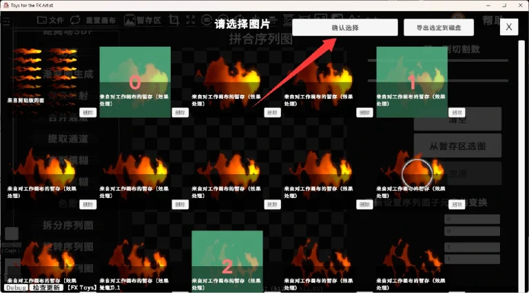 进入功能块后,先指定这个序列图的行列数,再直接点击要提取的子元素,支持多选,选择完成后可直接导出到磁盘或先存入暂存区。