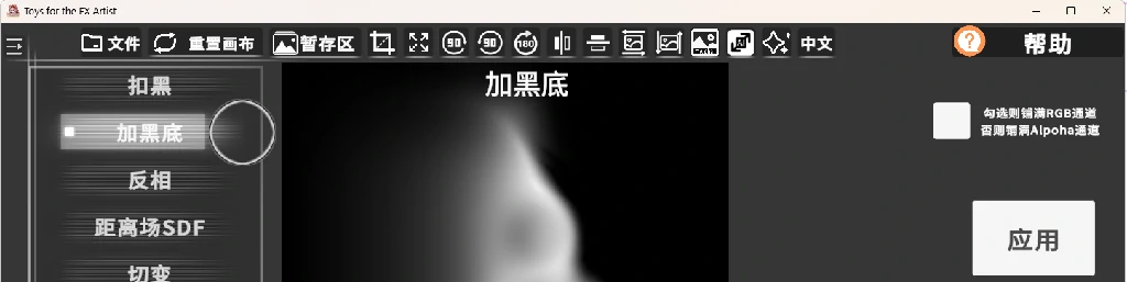 加黑底:如果你需要,可以在这里舍弃你的Alpha通道,将Alpha通道标记为纯黑。或是勾选开关 将RGB通道填满(损失RGB通道中的暗色信息 统一设置为白色,在拥有Alpha通道的图中使用有意义,否则只是得到一张白图)