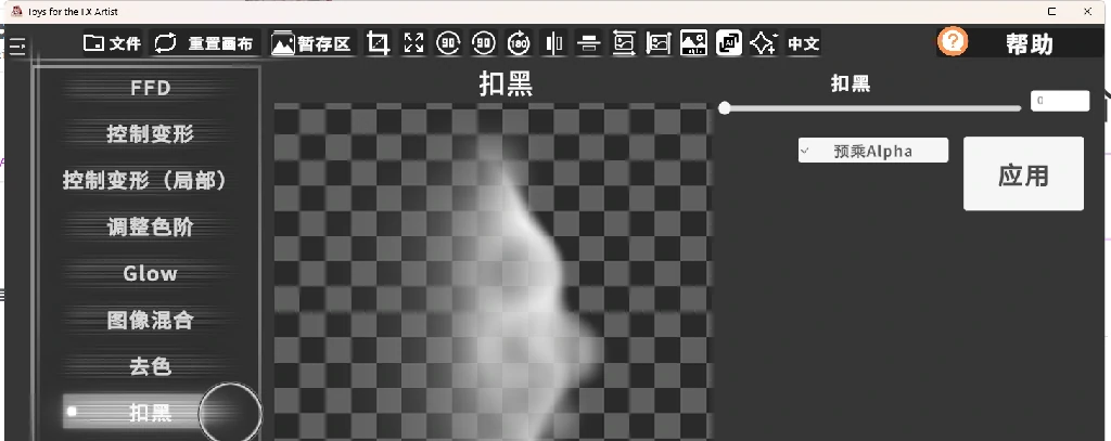扣黑:将你的图片依据颜色明暗信息 算出Alpha通道,使其拥有Alpha通道。如果你的图本来就有Alpha通道 可以勾选预乘ALPha以修正可能遇到的显示问题。