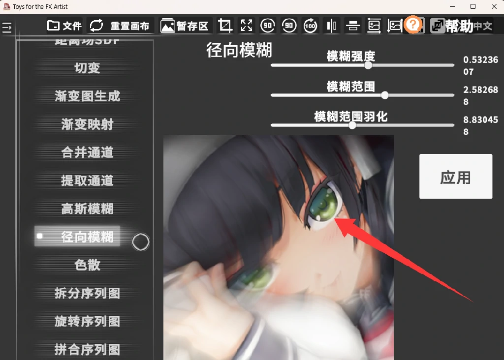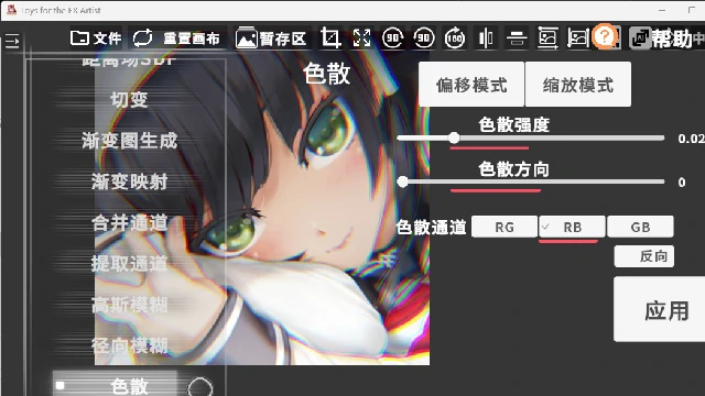 在这里对整张图进行快速色散,可选 偏移模式、缩放模式,然后再调整色散强度和方向,也可决定色散通道 默认是RB。